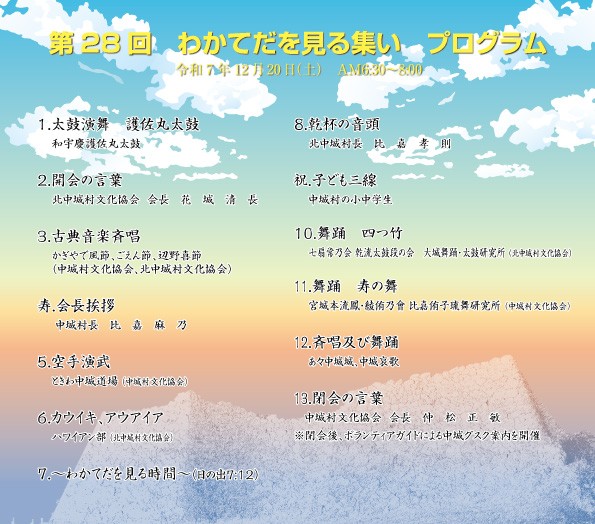 昔から冬至の日は、太陽が生まれ変わると言われており、『わかてだ(若い太陽)』の日の出を世界遺産「中城城跡」で迎え、讃えることで強く生き抜く力を育むと共に、中城・北中城の両村が未来永劫に発展することを祈願する集いです。